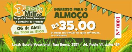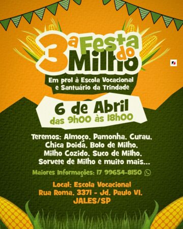 A 3ª Edição da Festa do Milho em prol à Escola Vocacional e Santuário da Santíssima Trindade irá acontecer no dia 6 de abril (domingo), na Escola Vocacional, em Jales, das 9h às 18h.