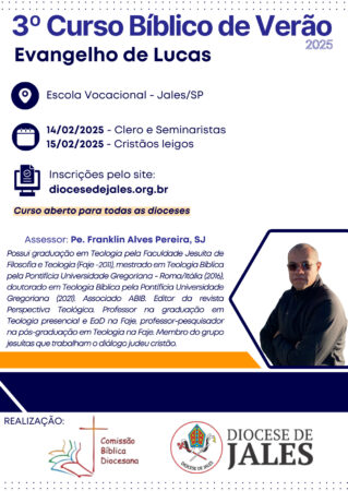 Este ano, que irá assessorar o curso é o padre jesuíta Franklin Alves Pereira. Ele possui graduação em Teologia pela FAJE (Faculdade Jesuíta de Filosofia e Teologia – Belo Horizonte/MG), em 2011; mestrado em Teologia Bíblica pela Pontifícia Universidade Gregoriana (Roma/Itália), em 2016; doutorado em Teologia Bíblica pela mesma universidade, em 2021. Atualmente, é professor na graduação em Teologia presencial e EaD na FAJE, professor-pesquisador na pós-graduação em Teologia nessa mesma instituição superior de ensino. Padre Franklin é editor da revista Perspectiva Teológica – periódico do programa de pós-graduação da FAJE. Ele é membro-associado da ABIB (Associação Brasileira de Pesquisa Bíblica), bem como, membro do grupo Jesuits and Judaism (jesuítas que trabalham o diálogo judeu cristão).