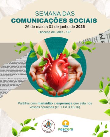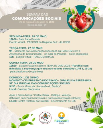 – E no domingo, dia 1º de junho, Momento Celebrativo Diocesano – Jubileu da Esperança – celebrando o 59º Dia Mundial das Comunicações Sociais, com Santa Missa às 9h30, na Catedral de Jales.