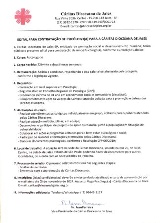 A Cáritas Diocesana de Jales/SP, entidade de promoção social e desenvolvimento humano, abriu processo seletivo para contratação de psicólogo(a).