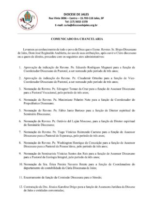 Levamos ao conhecimento de todo o povo de Deus que o Exmo. Revmo. Sr. Bispo Diocesano de Jales, Dom José Reginaldo Andrietta, no uso de suas atribuições, após ouvir o Clero diocesano ou a quem de direito, procedeu com os seguintes atos administrativos: