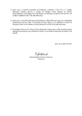 14. Após ouvir o Conselho Diocesano de Presbíteros, o Bispo Diocesano aprovou a Ordenação Presbiteral do Revmo. Diác. Vitor Rafael da Silva Aguiar, a ser celebrada na Matriz da Paróquia Cristo Luz do Mundo, em Ilha Solteira-SP, no dia 05 de julho deste ano;