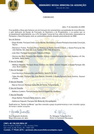 Comunicado sobre a Pastoral dos Seminaristas em 2026 – Diocese de Jales