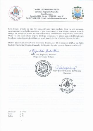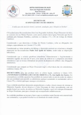 DECRETO DE SUSPENSÃO DO USO DE ORDENS – Pe. José Igídio dos Santos