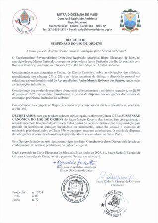DECRETO DE SUSPENSÃO DO USO DE ORDENS – Pe. Marcio Roberto dos Santos