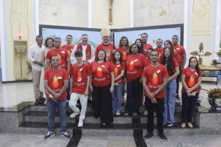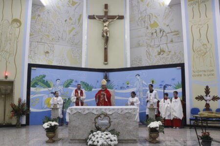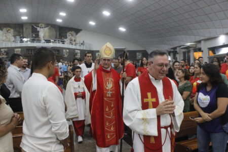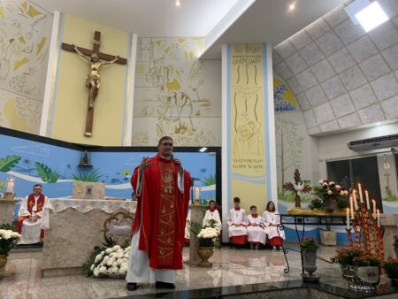 O administrador paroquial, padre Miguel Donizete Garcia, concelebrou com Dom Reginaldo e confiou seus paroquianos ao sacramento da Confirmação (Crisma).