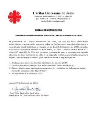 A Assembleia Geral Ordinária da Cáritas Diocesana de Jales acontecerá no dia 22 de fevereiro de 2025, sábado, na Escola Vocacional, em Jales, das 8h às 12h, em primeira convocação, com a presença da maioria absoluta de seus membros, às 8h, e em segunda e última convocação, uma hora depois, com qualquer número.
