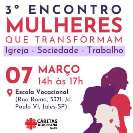 No dia 7 de março, sábado, a partir das 14h, será realizado na Escola Vocacional, em Jales-SP, o 3º Encontro de Mulheres que Transformam, promovido pela Cáritas Diocesana de Jales.
