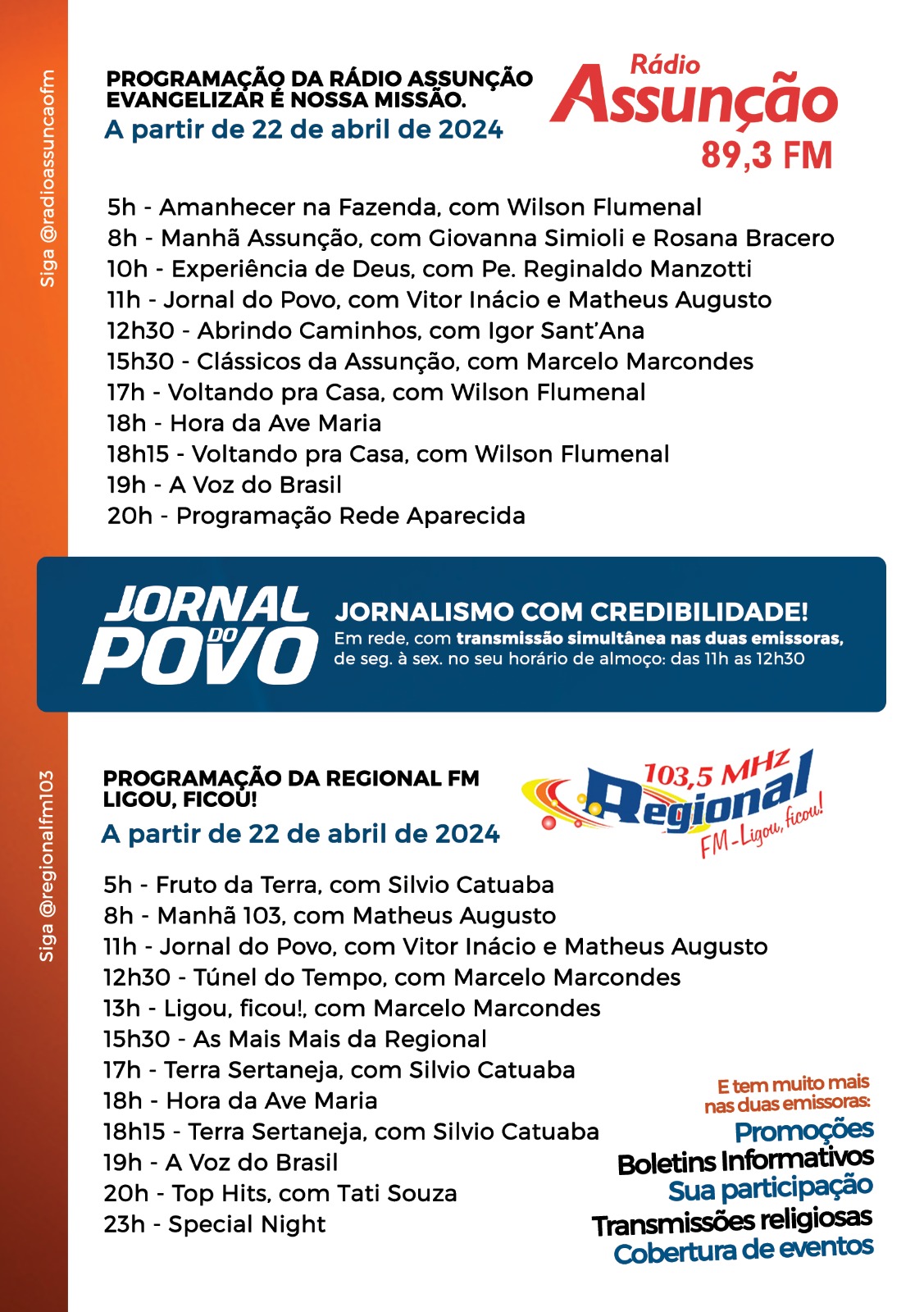 As rádios Assunção e Regional FMs, que integram o grupo de comunicação da Diocese de Jales, vão estrear uma série de novidades na programação no dia 22 de abril, segunda-feira. Os ouvintes vão conhecer novos programas, quadros e diversas inovações, que vão proporcionar ainda mais interatividade, marca registrada das emissoras.