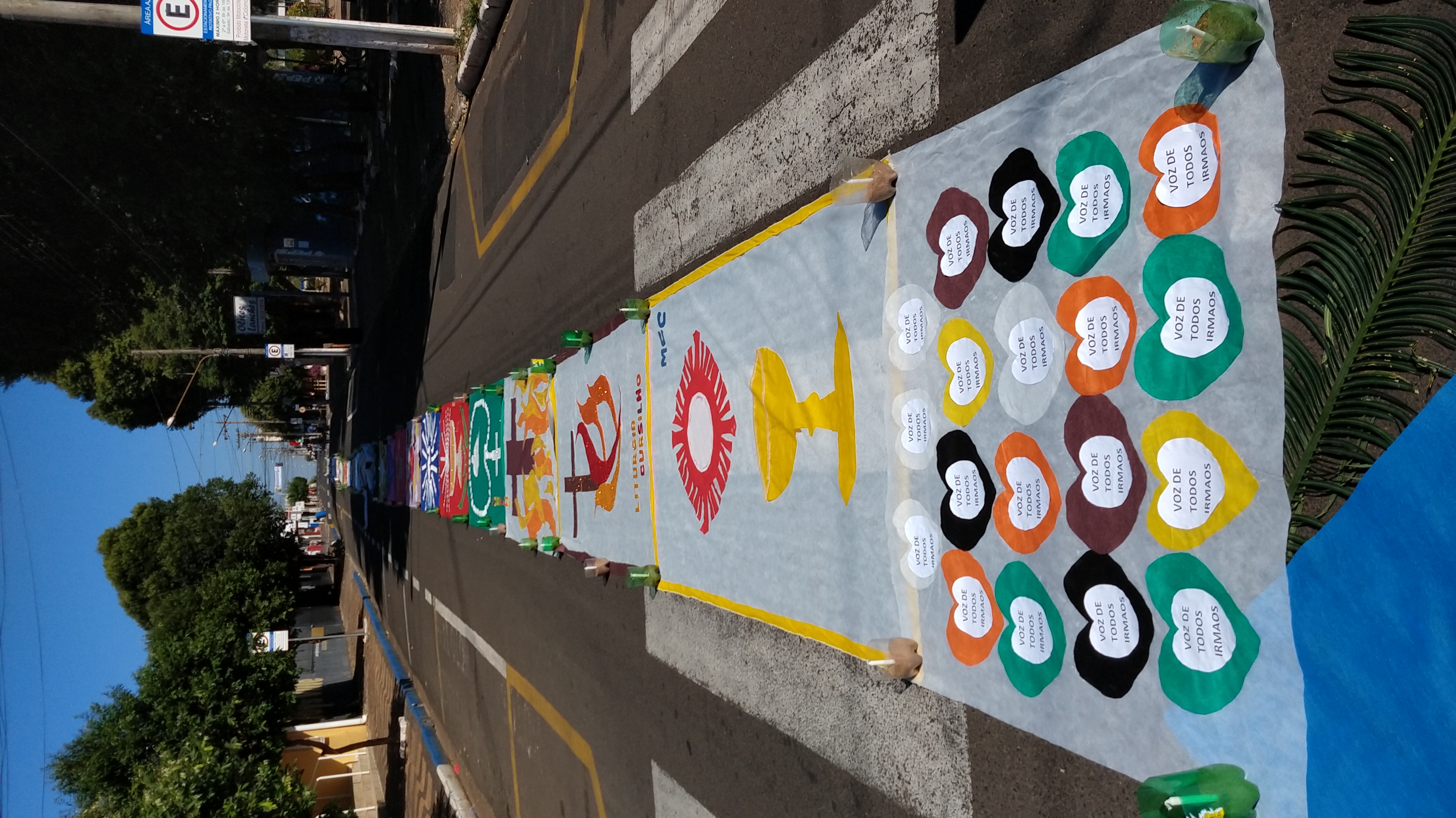 Os desenhos com alusão ao corpo de Cristo (motivo da celebração) e a outros temas católicos (inclusive com referências às equipes responsáveis) foram elaborados sobre recortes de TNT e fixados ao chão com pedaços de garrafas plásticas, preenchidos com areia. Cada garrafa continha uma vela que foi acesa na hora da cerimônia, iluminando o caminho da procissão e dando um toque ainda mais bonito à ocasião.