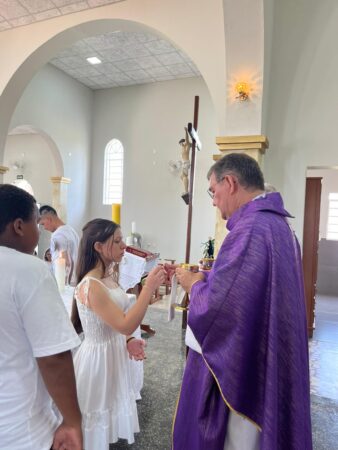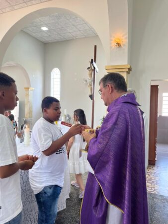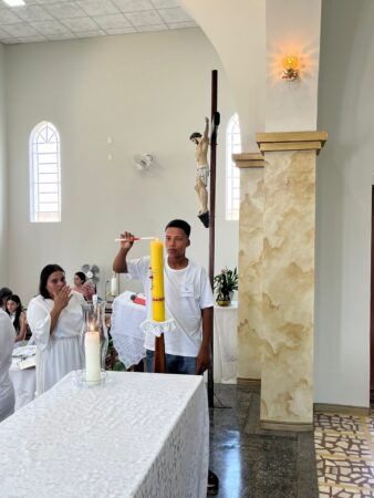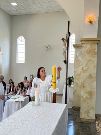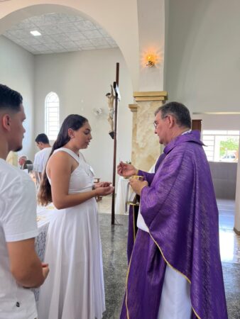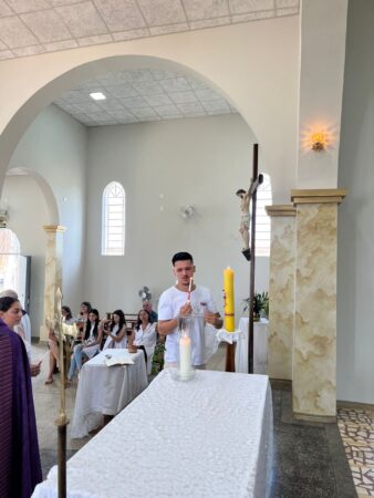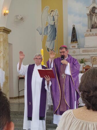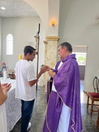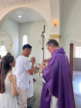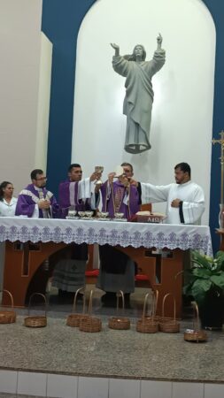 As missas das crismas foram concelebradas pelos padres Natalino Sérgio de Araújo (Fernandópolis), Deoclides Messias Lolis (Santa Clara d’Oeste) e Claudemir Ortunho (Ouroeste). O diácono Vitor Rafael também participou da celebração na paróquia de Ouroeste.