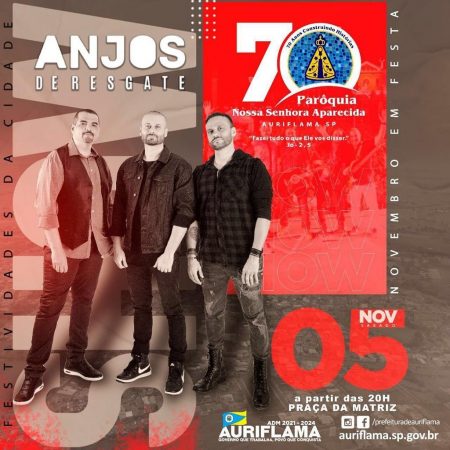 Em sintonia com as comemorações dos 70 anos da Paróquia Nossa Senhora Aparecida, será realizado um show com a Banda Anjos de Resgate em Auriflama, a partir das 20h, na Praça da Matriz. Todos os jovens estão convidados, o evento é aberto e contará com momentos especiais. A apresentação marca o encerramento do Ano Jubilar da Paróquia e inicia as comemorações do aniversário do município, em parceria com a Prefeitura de Auriflama.